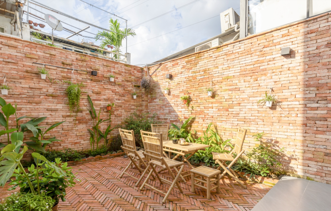 Mặt tiền mở: Mặt tiền với khoảng sân rộng rãi mở ra một không gian thoáng đãng, mang lại cảm giác thân thuộc và bình yên. Vật liệu chủ đạo: Vật liệu chính của dự án là gạch đỏ đất nung – một lựa chọn bền vững và thân thiện với môi trường. Sắc đỏ ấm áp của gạch đất nung không chỉ mang lại cảm giác ấm cúng mà còn giúp công trình hòa mình một cách tự nhiên vào cảnh quan xung quanh.