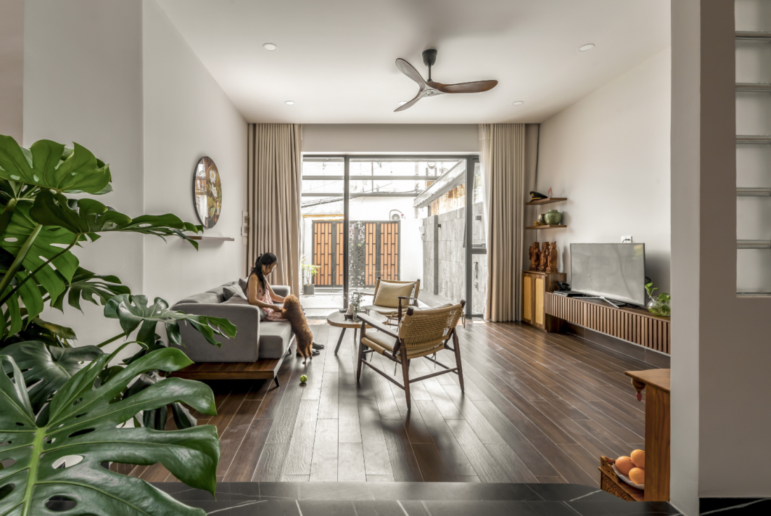 View từ gian không gian bếp hướng ra phòng khách và khoảng sân trước nhà.