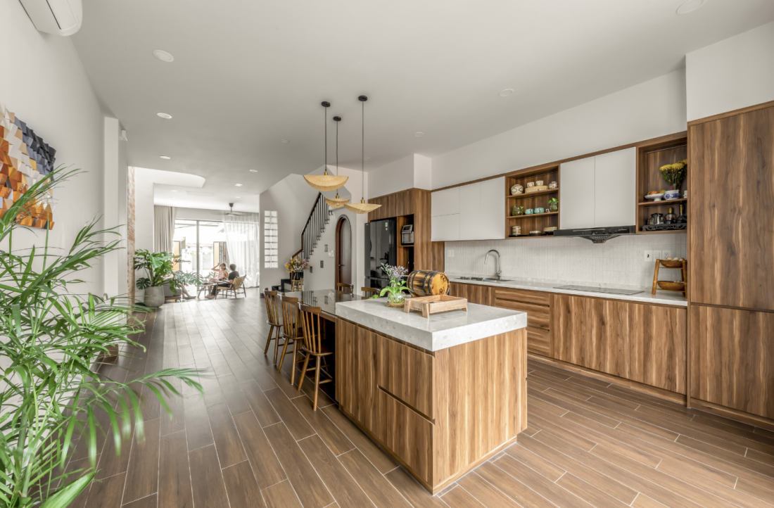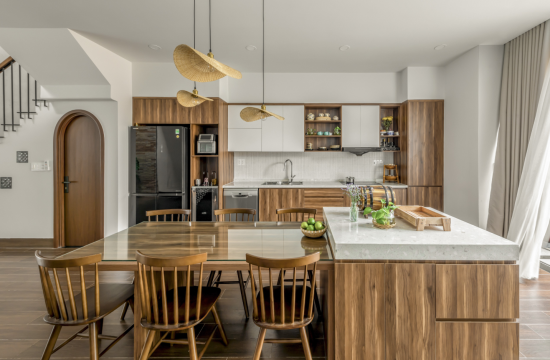 Không gian bếp nâng bậc: Nội thất được lựa chọn cẩn thận với đường nét đơn giản và màu sắc trang nhã. Vật liệu gỗ ấm áp được kết hợp với các đồ vật và thiết bị hiện đại, tạo nên một sự pha trộn tinh tế giữa phong cách hiện đại và truyền thống.
