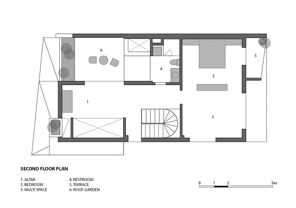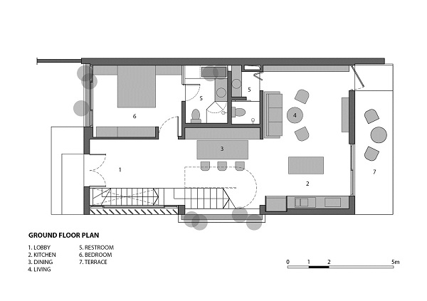 Tầng hầm với yêu cầu phòng cho người giúp việc cũng cần phải thiết kế có không gian mở để nhận ánh sáng mặt trời trực tiếp nhưng vẫn phải đủ gần và kết nối dễ dàng thuận tiện cho việc chăm sóc bố mẹ lớn tuổi. Đây cũng chính là lý do vì sao trục thang máy bị thay đổi và phần mở của hố thang xuống tầng hầm cũng được tính toán để đưa sang mặt đứng bên hướng Tây để tiếp cận ánh sáng mặt trời tự nhiên nhiều nhất và cũng đưa ánh sáng này sâu nhất vào tầng hầm.