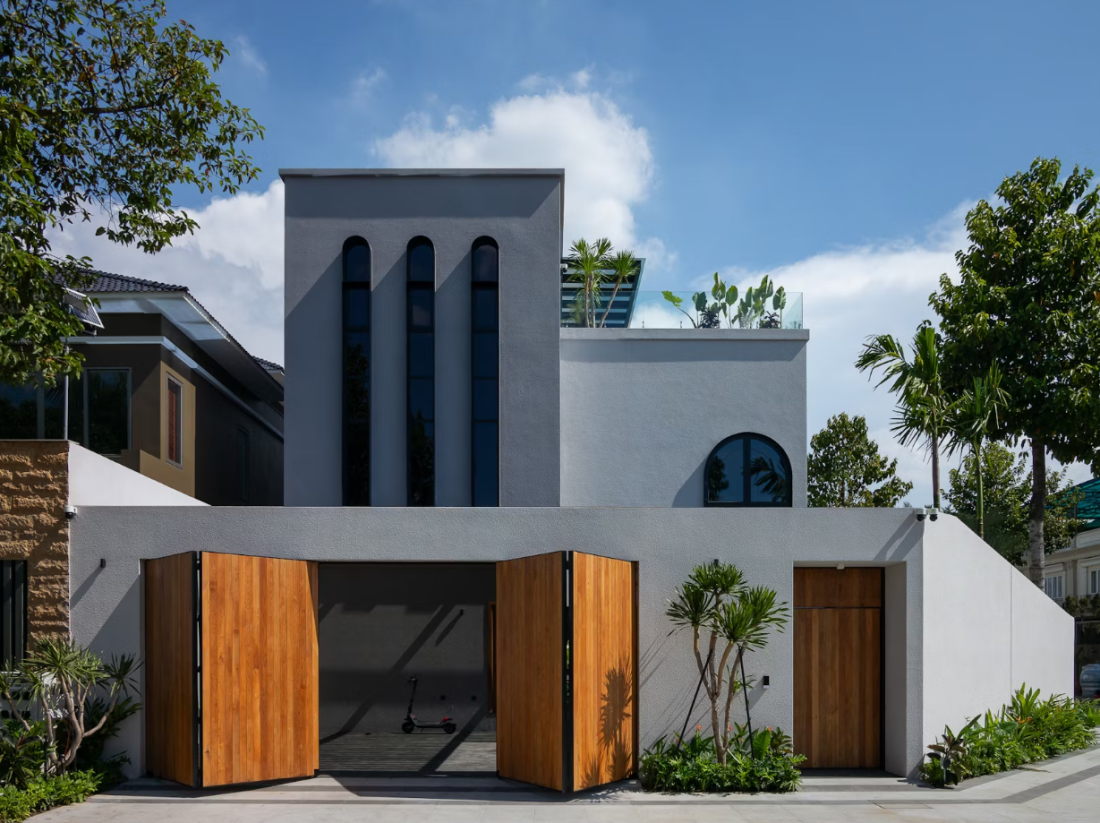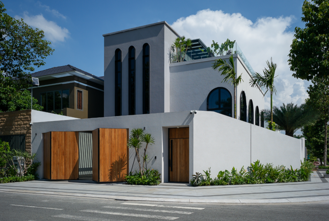 Mặt tiền của biệt thự thể hiện sự duyên dáng và tính thực tiễn. Ô cửa vòm mềm mại. Một chuỗi các ô cửa vòm lớn mang lại cảm giác mềm mại, đồng thời tạo ra sự uyển chuyển thị giác cho mặt tiền.