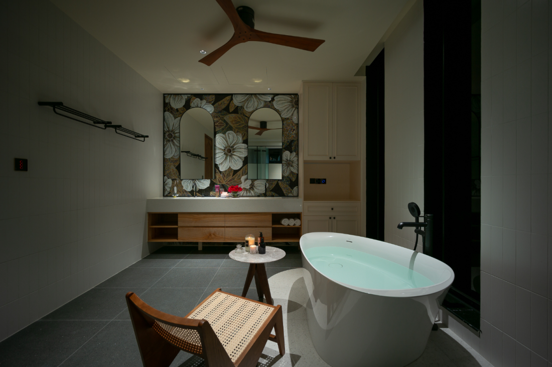 Tiếp nối mạch thiết kế, phong cách tiếp tục hiện diện trong phòng tắm qua hệ tủ, tường trang trí. Đặc biệt là bồn tắm nằm ấn tượng đầy cá tính.