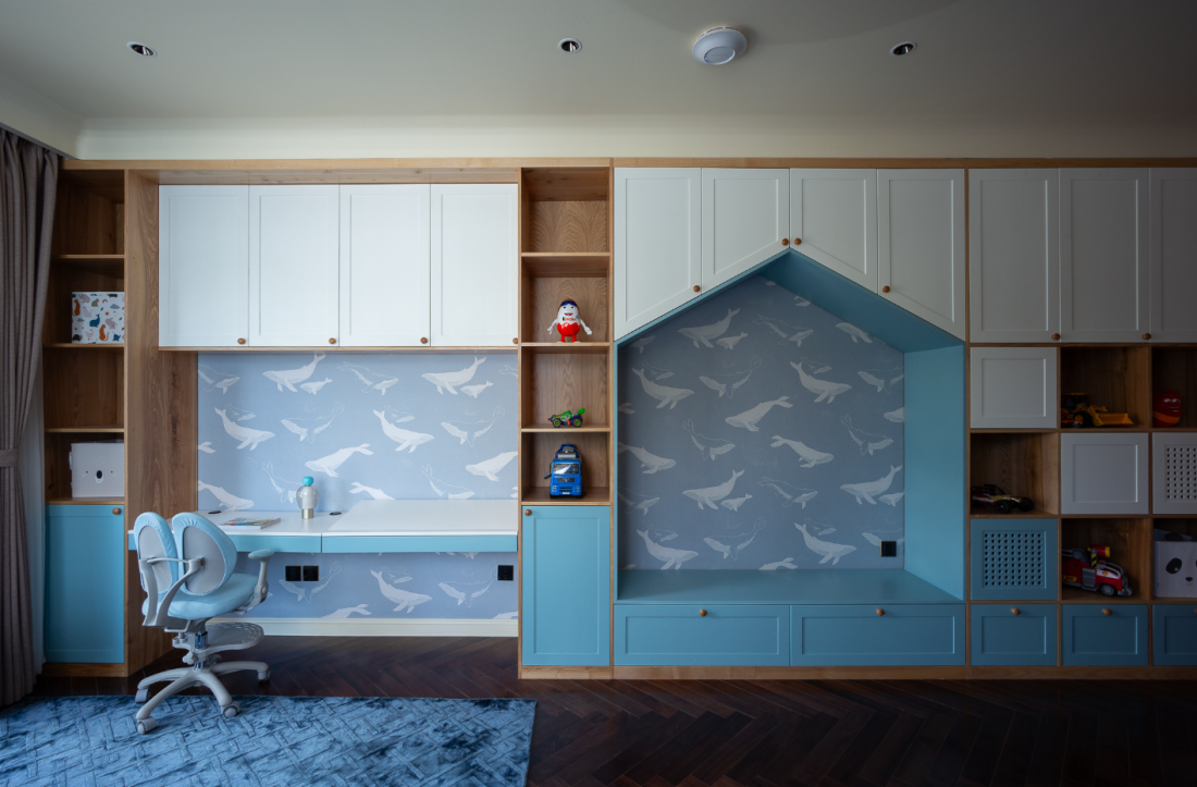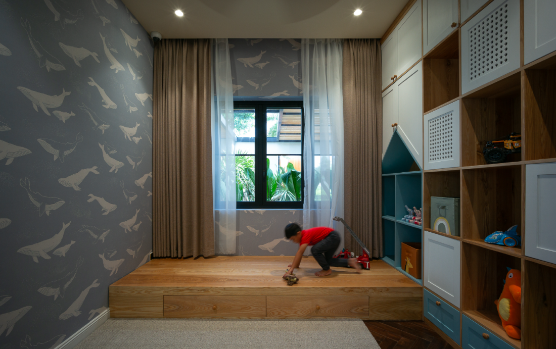 Trái ngược với phòng ngủ Master thì phòng ngủ con năng động và vui nhộn hơn. Hệ tủ thiết kế linh động cho việc sinh hoạt và lưu trữ.