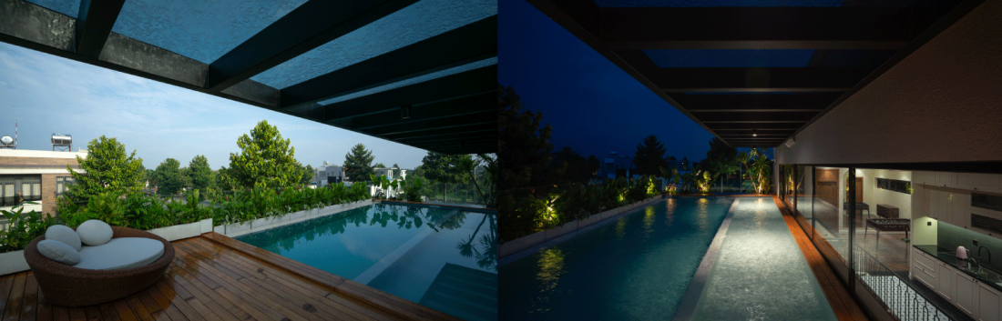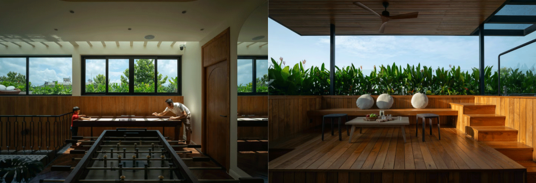 Tính năng đặc biệt nhất của ngôi nhà nằm ở không gian tầng thượng (tầng 3). Khu vực đa năng bao gồm phòng chơi, một kho chứa đồ nhỏ và hồ bơi. Hồ bơi được đặt cạnh các không gian trong nhà và được bao bọc bởi cửa kính lớn.