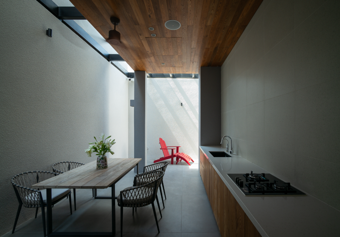 Bức tường bao cao với một đường cắt chéo đầy tính điêu khắc đã mang lại cá tính riêng cho mặt tiền, đồng thời là lớp bảo vệ vững chắc, giữ cho ngôi nhà luôn riêng tư khỏi thế giới bên ngoài.