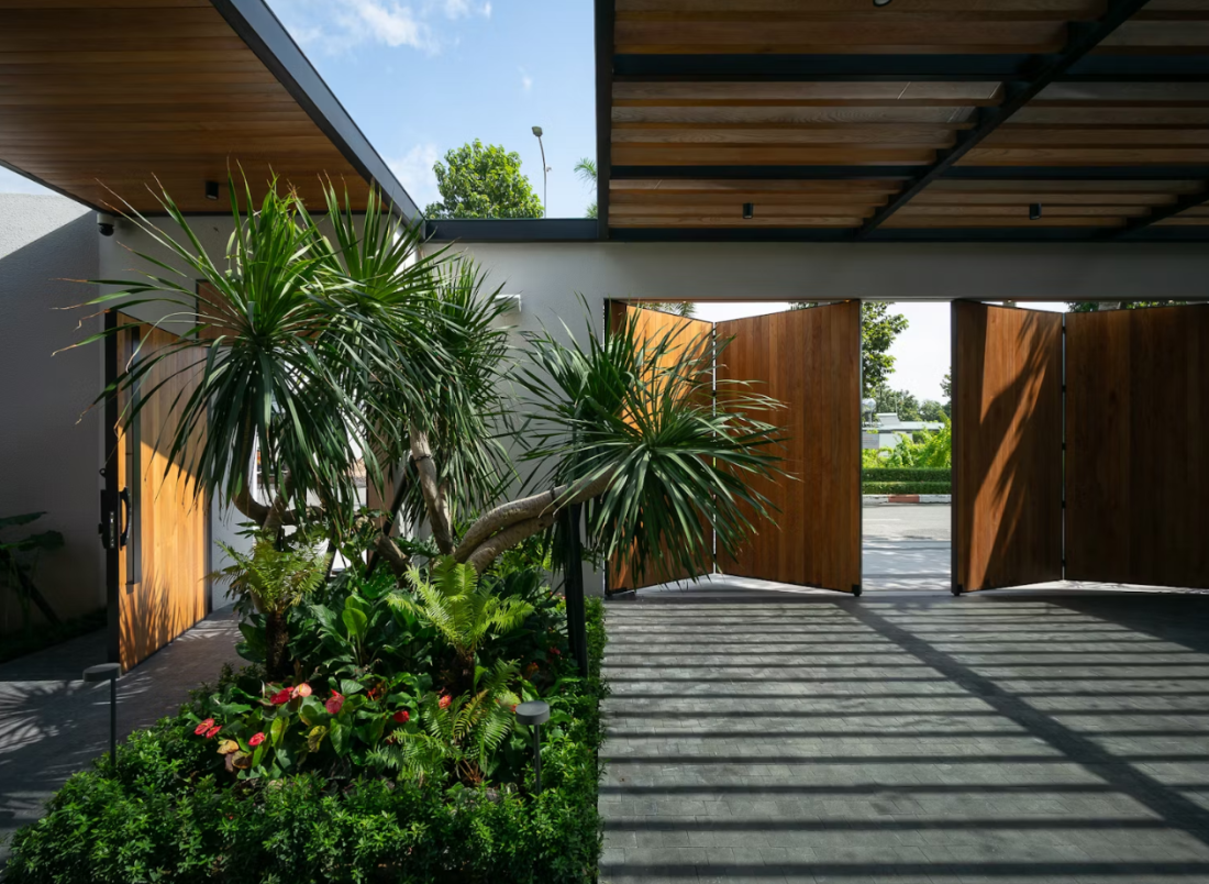 Ánh nắng mặt trời đi vào nhà một cách nhẹ nhàng thông qua các tán cây xanh, giúp làm ấm sàn nhà và khu vực bàn ăn sáng, tránh sự gay gắt trực tiếp. Thông gió tự nhiên: Gió dễ dàng lùa qua các cửa mở bên hông, giữ cho ngôi nhà luôn mát mẻ mà không cần phụ thuộc quá nhiều vào quạt hay điều hòa, thể hiện sự tôn trọng các giải pháp thụ động.