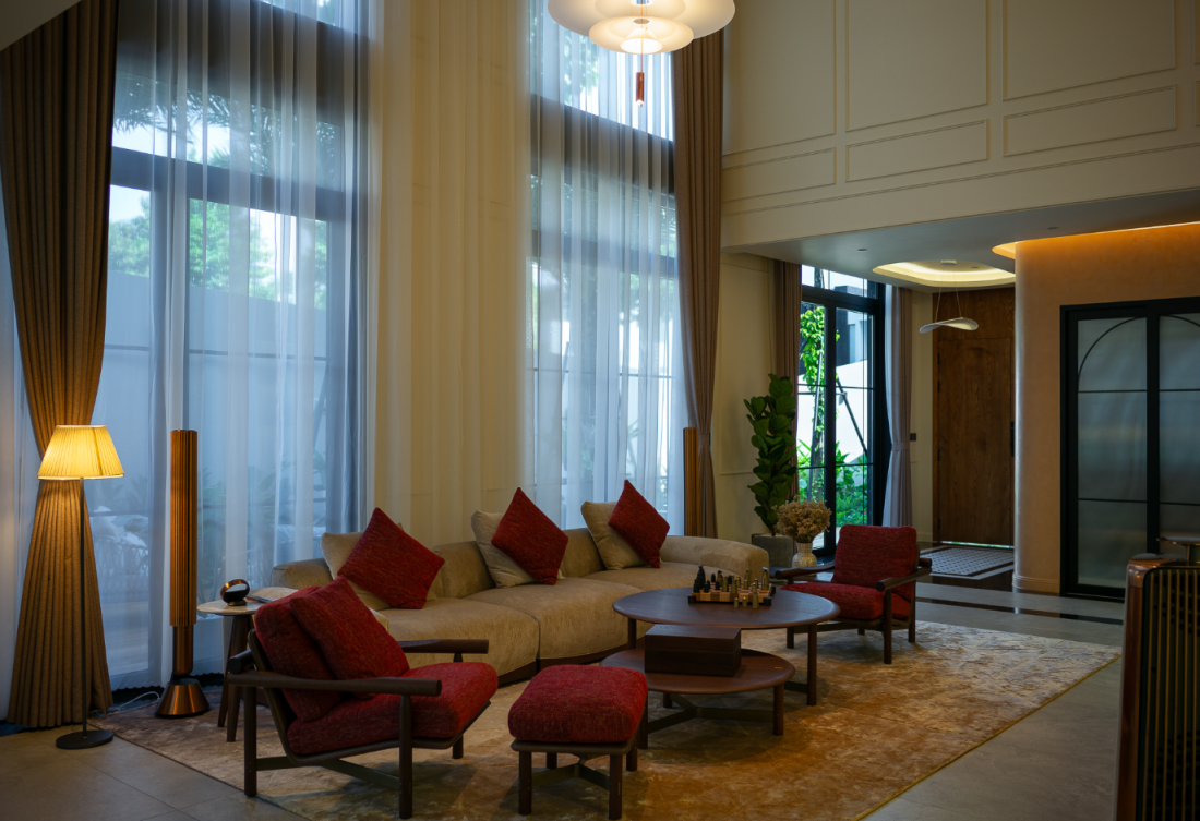 Không gian nội thất được tổ chức để tạo cảm giác yên tĩnh và tự nhiên, đủ riêng tư nhưng vẫn mở để đón không khí và tầm nhìn ra vườn. Tông màu chủ đạo màu be nhạt được sử dụng xuyên suốt để tạo sự ấm áp và rõ ràng. Tầng 1 là không gian sinh hoạt chung, bước vào sảnh là phòng khách rộng trần cao, sofa bigsize cùng cặp ghế bành nhung đỏ.