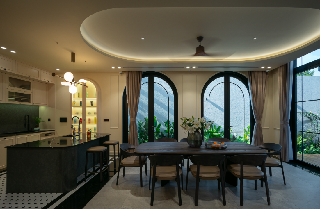 Kế phòng khách là khu vực ăn uống với bàn ăn rộng đủ dáp ứng cho các thành viên. Đảo bếp tông xanh mát mặt đá đen và bếp hình chữ I trắng sáng.