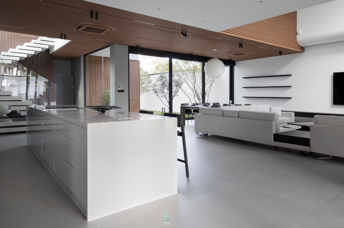 Giải pháp cấu trúc: Để duy trì sự liên tục của không gian, các kiến trúc sư đã sử dụng giải pháp nhịp lớn, đẩy hệ cột ra xa nhau nhất có thể. Điều này giúp loại bỏ những điểm nghẽn thị giác, tạo ra một dòng chảy không gian xuyên suốt từ phòng khách, bếp đến phòng ăn. Gia chủ có thể cảm nhận được sự tự do tuyệt đối trong chính biệt thự của mình – một không gian không có giới hạn bởi những bức tường ngăn cách.