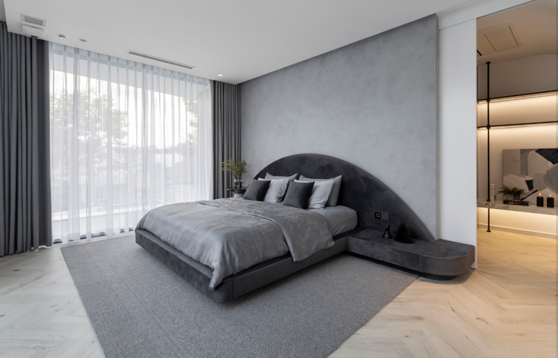 Hệ thống cửa kính lớn không chỉ có nhiệm vụ kết nối nội - ngoại thất mà còn là lớp màng lọc âm thanh công nghệ cao. Kết hợp với vật liệu hoàn thiện và hệ thống Smart home, biệt thự tự điều chỉnh để đảm bảo rằng ngay khi bước qua cánh cửa, nhịp sống hối hả của Bình Dương hoàn toàn bị đẩy lùi, nhường chỗ cho sự tập trung cho công việc và sự nghỉ ngơi thuần khiết.