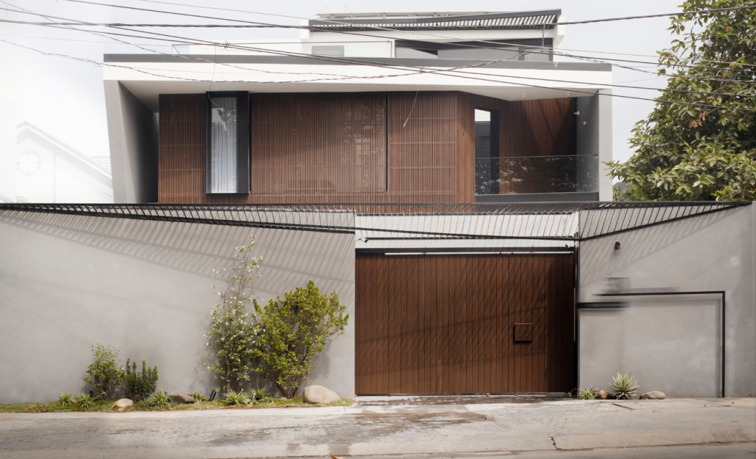 Ngay từ cái nhìn đầu tiên, mặt tiền của biệt thự gây ấn tượng bởi những đường nét hình học nằm ngang mạnh mẽ. Sự giao thoa giữa các khối tích không chỉ tạo ra diện mạo năng động, bất quy tắc mà còn tạo ra những khoảng lùi, hàng hiên có chiều sâu.