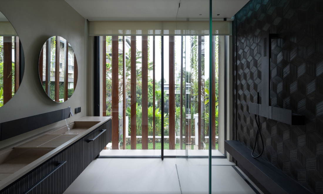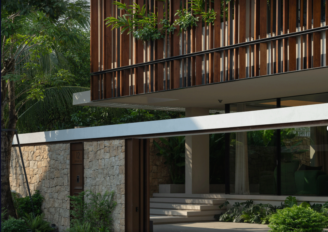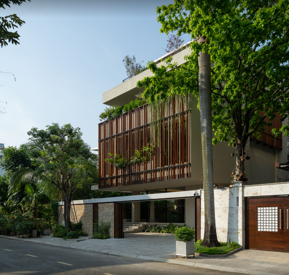 Hệ lam gỗ và ban công sâu: lớp vỏ đa năng. Để thích ứng với khí hậu nhiệt đới nắng lắm mưa nhiều, lớp vỏ của biệt thự được trang bị hệ lam gỗ chắn nắng và những ban công sâu.