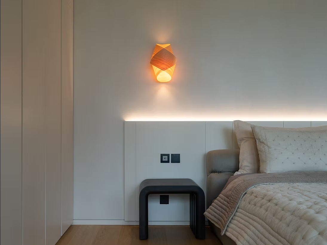 Tab đầu giường tích hợp đèn led âm tường, kết hợp bàn đầu giường tiện dụng.
