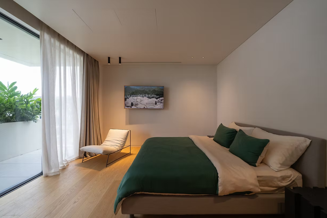 Các phòng ngủ được thiết kế với ban công có chiều sâu lớn, kết hợp cùng dải cây xanh. Đây là lá chắn bảo vệ hệ thống cửa sổ khỏi những cơn mưa rào bất chợt và giảm bức xạ nhiệt vào phòng, giúp cải thiện chất lượng không khí đáng kể.