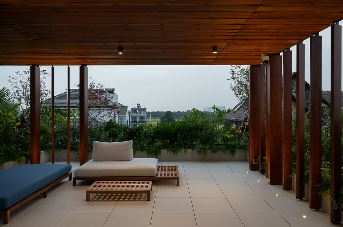 Điểm nhấn cuối cùng của ngôi nhà là sân thượng có mái che, nơi sở hữu tầm nhìn khoáng đạt ra dòng sông Sài Gòn và công viên lân cận. Được thiết kế như một khu vực ẩm thực và thư giãn ngoài trời với cây xanh bao quanh, không gian này là nơi lý tưởng để gia chủ thưởng ngoạn gió trời và cảnh quan thiên nhiên, trốn khỏi sự xô bồ của thành phố.