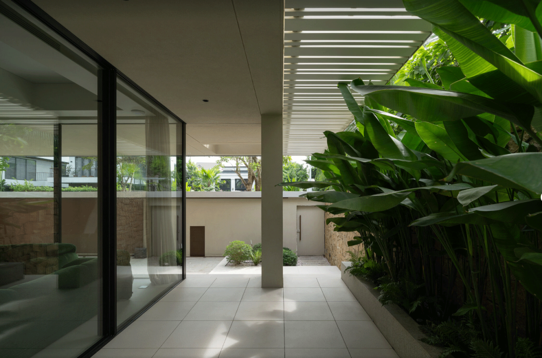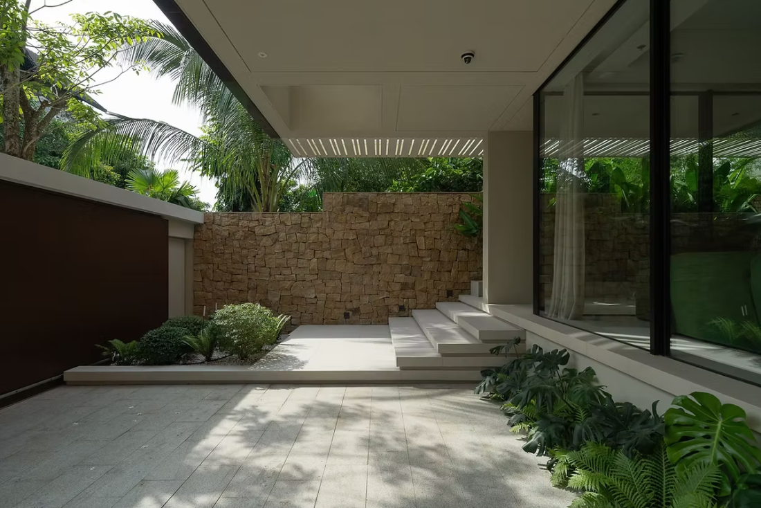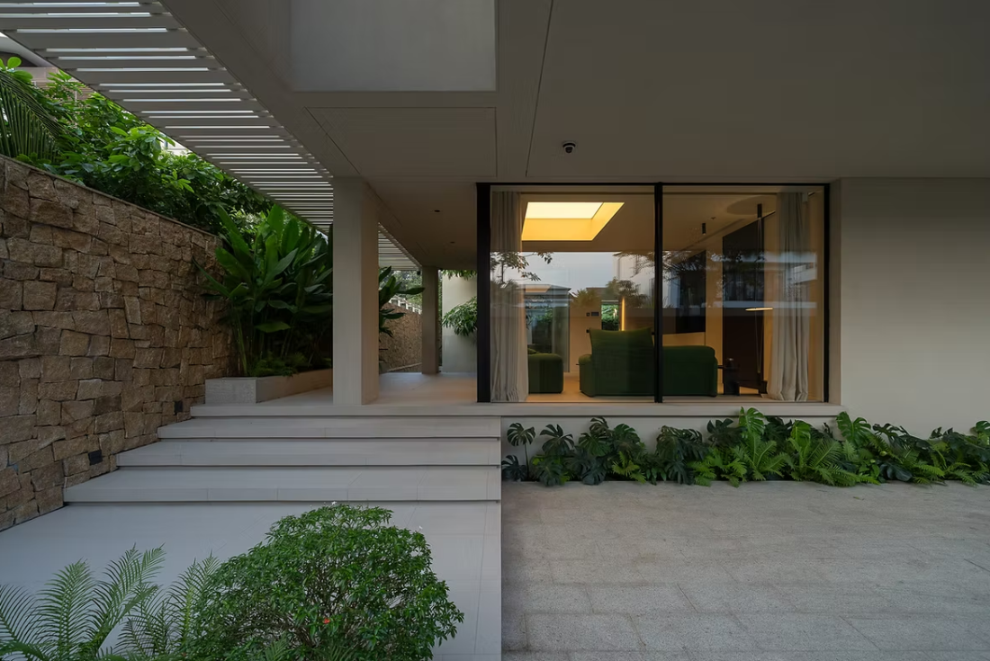 Giải pháp này tạo ra một dòng chảy không khí tự nhiên, giúp biệt thự luôn mát mẻ mà không cần quá phụ thuộc vào hệ thống điều hòa vào ban ngày. Việc sử dụng các vách kính lớn và không gian mở hoàn toàn khiến khu vườn như tràn vào trong nhà, biến mỗi bữa ăn hay những giờ phút nghỉ ngơi trở nên gần gũi với thiên nhiên hơn bao giờ hết.
