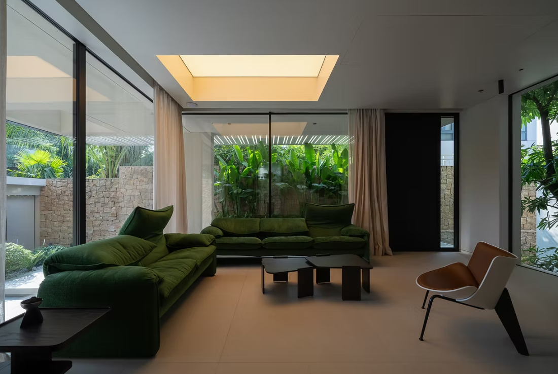 Ba hướng phòng khách đều nhìn thấy cây xanh và nhận ánh sáng tự nhiên.