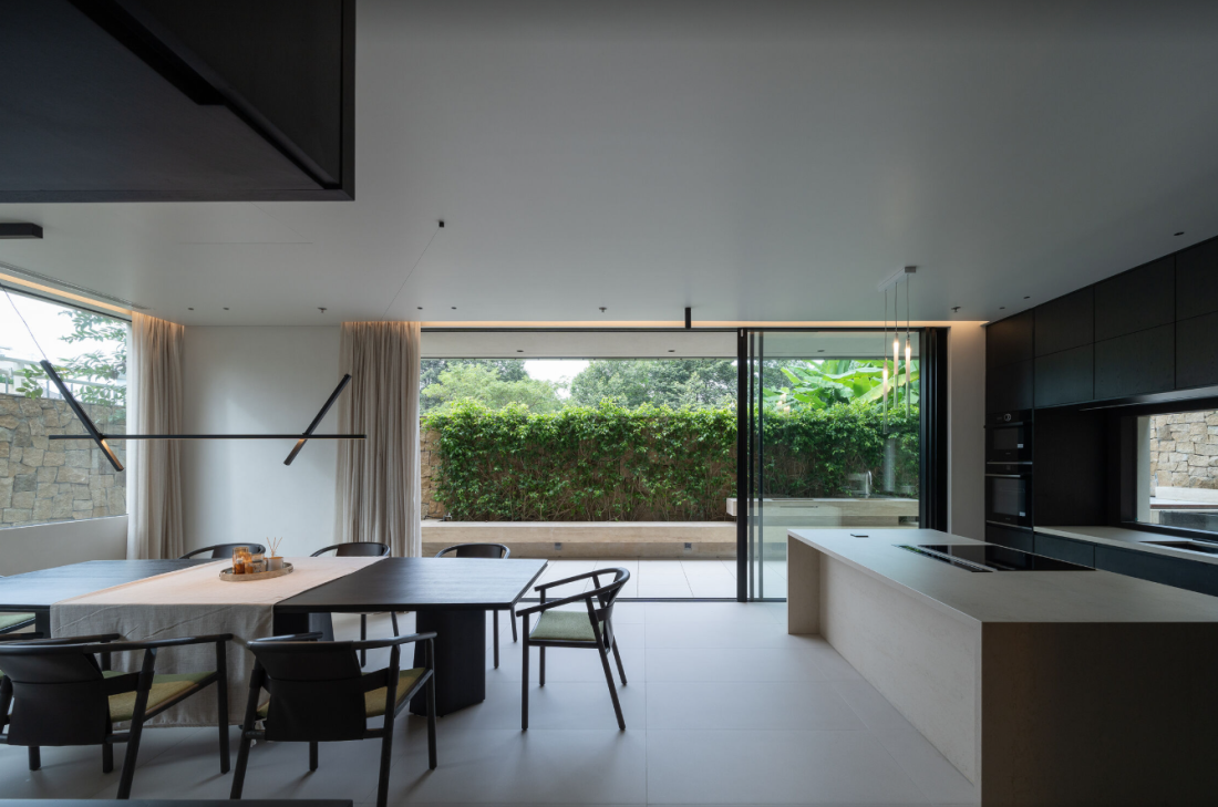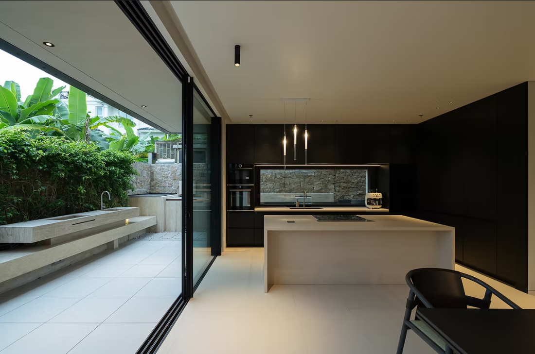 Bếp và khu vực bàn ăn mang sự cân bằng với gỗ đen và đảo bếp đá trắng, kết hợp với sân nhỏ bên cạnh ưu tiên bếp rửa tiện lợi.