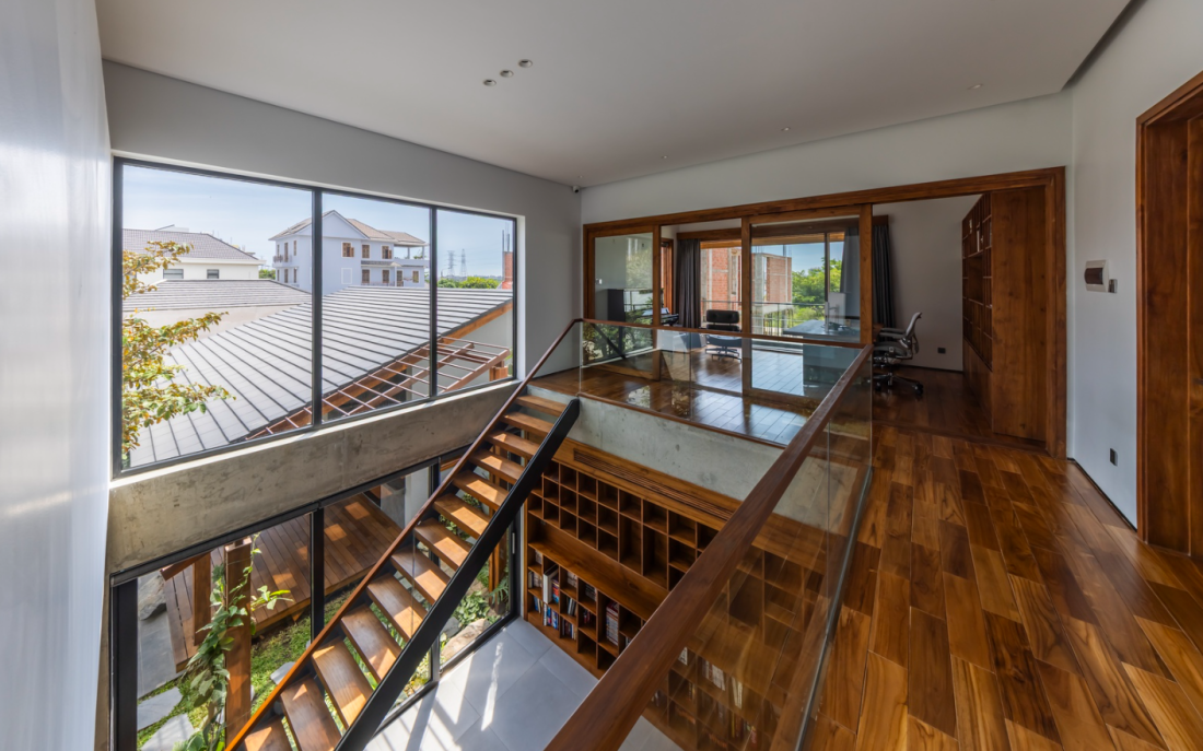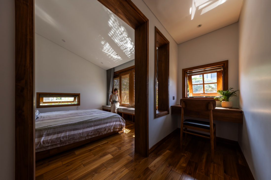 Tầng hai riêng tư hơn với phòng ngủ chính, phòng ngủ nhỏ, phòng thờ và góc làm việc linh hoạt. Khoảng trống trung tâm nối hai tầng, mang ánh sáng và gió tự nhiên.