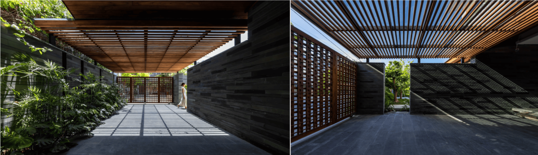 Mặt tiền hướng Tây Bắc có mái dốc và hiên sâu, chắn nắng mưa, tạo khu vực bán ngoài trời thoải mái. Nó như một lớp vỏ bảo vệ, che chắn tầm nhìn từ bên ngoài, đồng thời dẫn lối từ những không gian khép kín đến các khoảng mở hướng ra khu vườn xanh mát. Mặt tiền hướng Tây Bắc, thường chịu nắng gắt vào buổi chiều, được thiết kế với mái dốc và hiên sâu để chắn nắng và mưa, tạo nên một khu vực bán ngoài trời thoải mái.