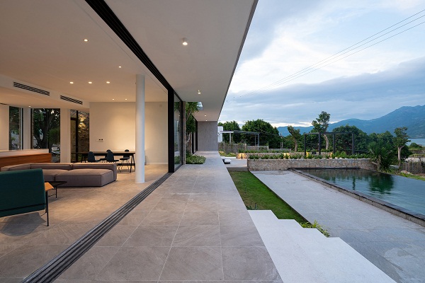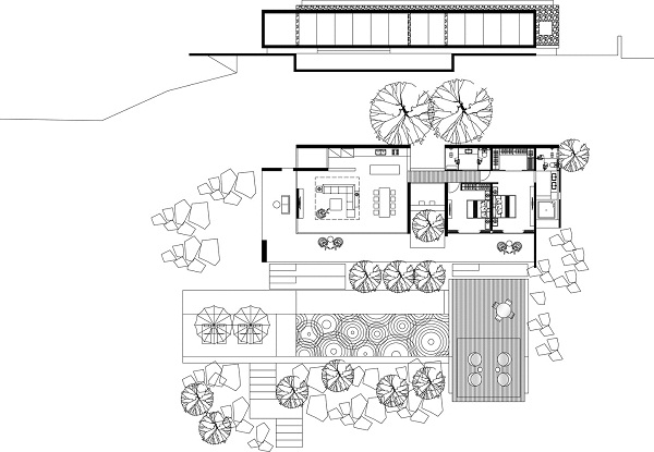 Ngôi nhà gồm hai khối xếp chồng lên nhau, với khối dài nằm trên độ cao nhất của khu đất, nơi đây bạn có thể nhìn thấy toàn bộ cảnh quan hùng vĩ.