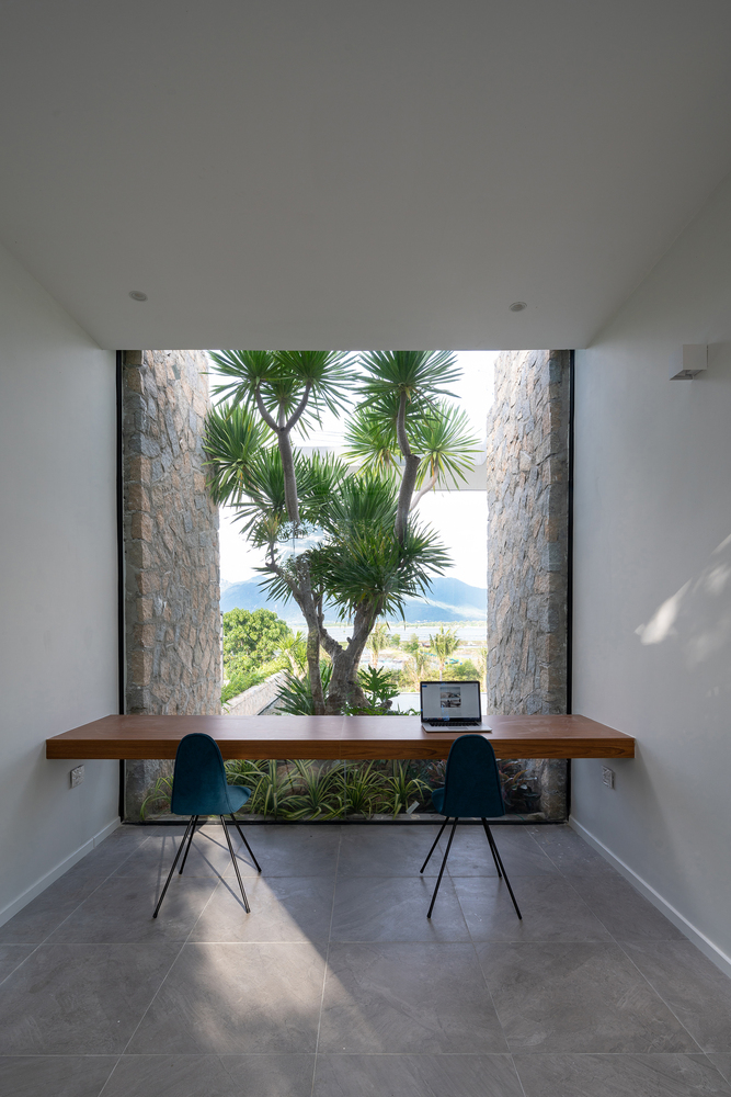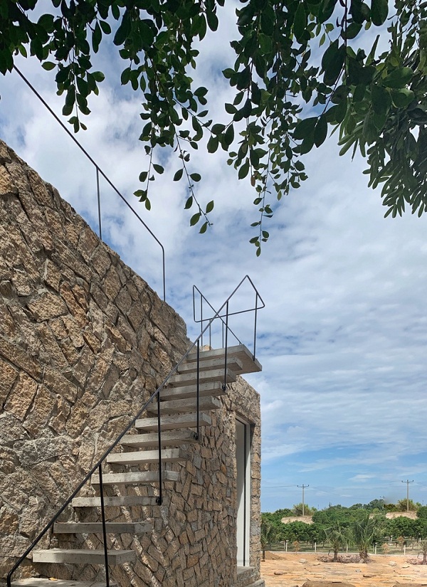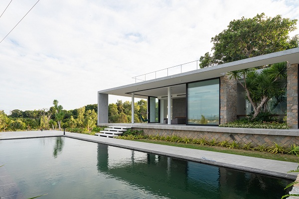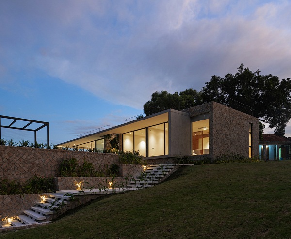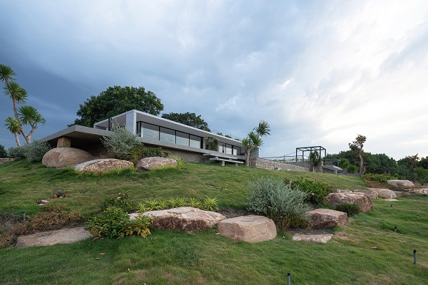 Ngôi nhà nằm trên đỉnh đồi với những tảng đả lớn ở trên. Dưới tán cây xoài lâu nằm vẫn còn sót lại trong vườn là nhìn ra dãy núi xa xăm. Những cửa kính rộng cao 3,2m được sử dụng giúp góc nhìn lớn hơn, đồng thời khiến cho không gian trong nhà và ngoài trời hòa hợp với nhau.