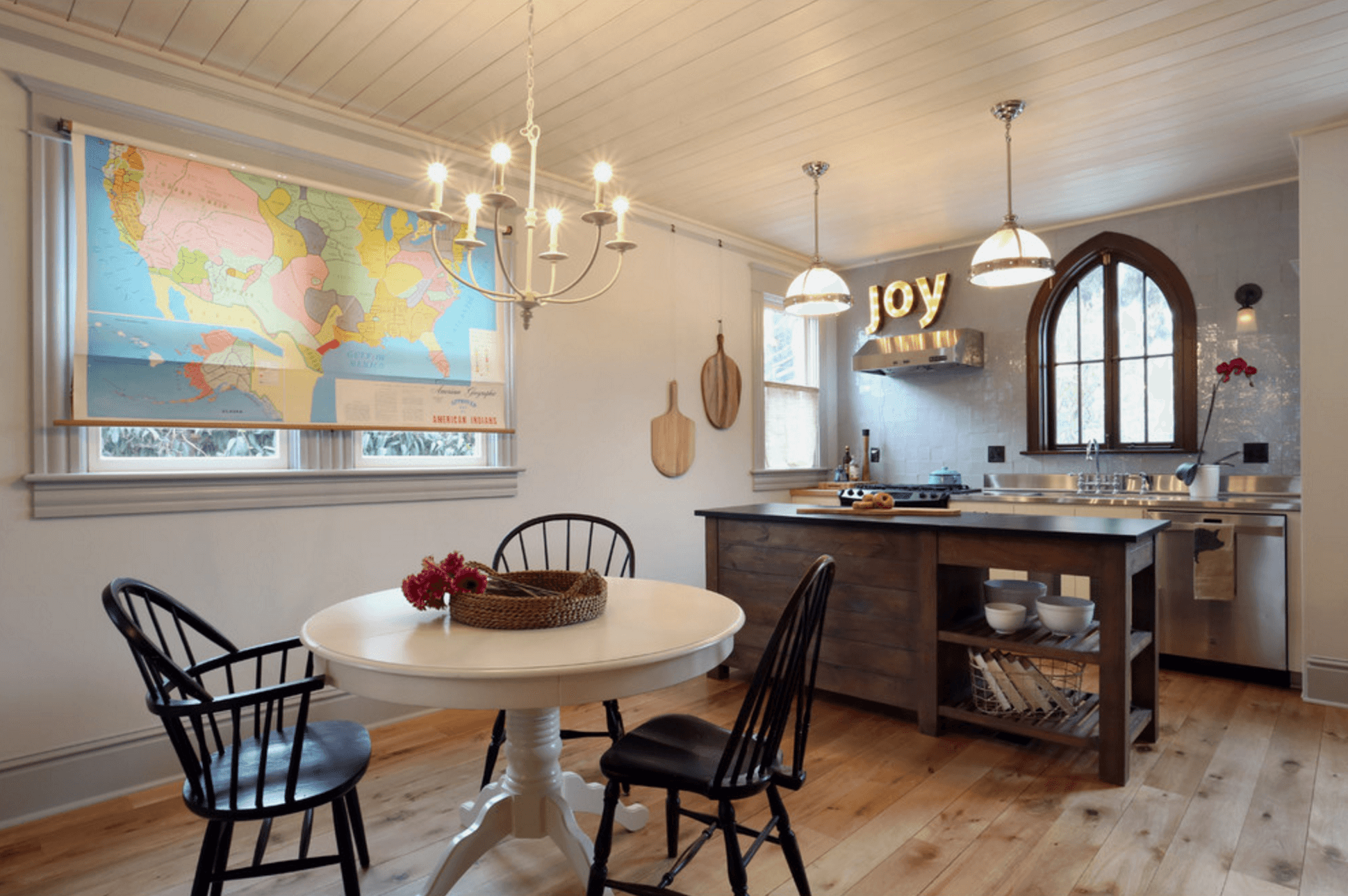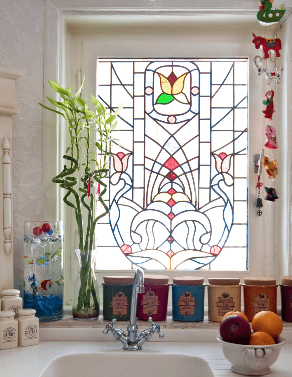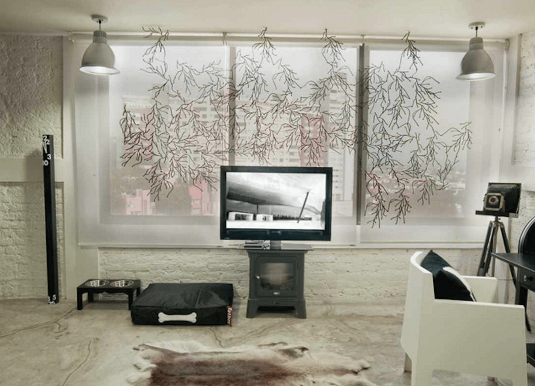 Sử dụng một tấm hình lớn hay bức tranh nghệ thuật hoặc một tấm bản đồ treo bên trong cửa sổ cũng là một ý tưởng hay.