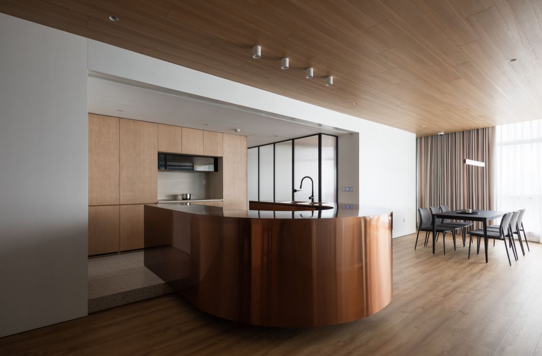 Về đảo bếp, nó được làm từ đồng nguyên khối với thiết kế độc đáo, chất liệu sáng bóng, quầy bar trở thành điểm nhấn của căn hộ.