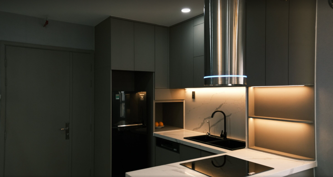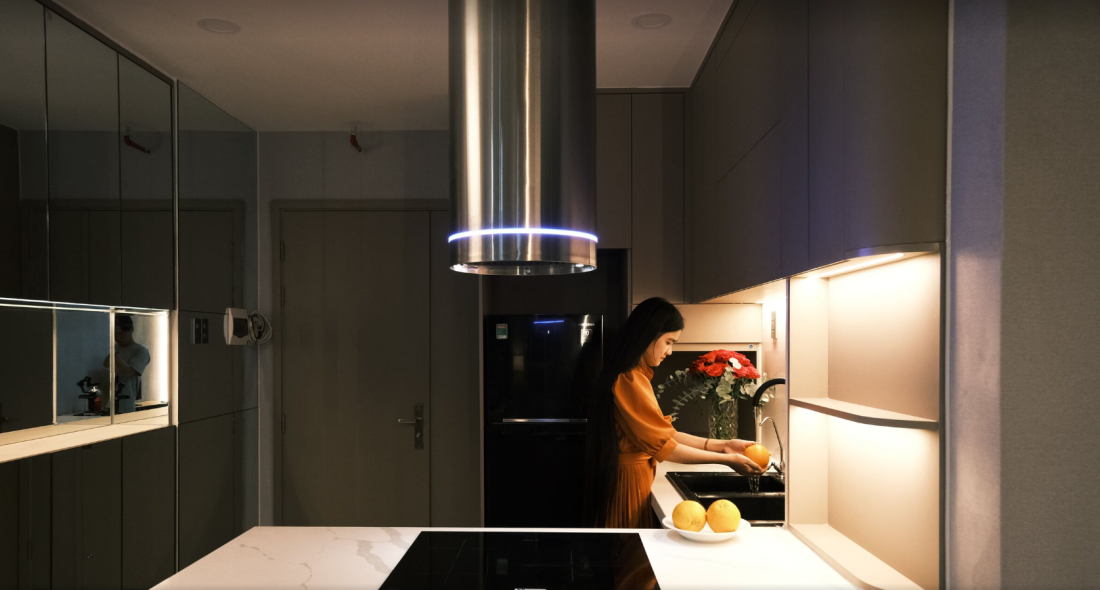Phòng khách và nhà bếp được thiết kế liền mạch, tạo nên một không gian thoáng đãng. Nhà bếp tuy nhỏ nhưng tiện nghi, với mặt bàn sáng bóng và tủ lưu trữ thông minh.