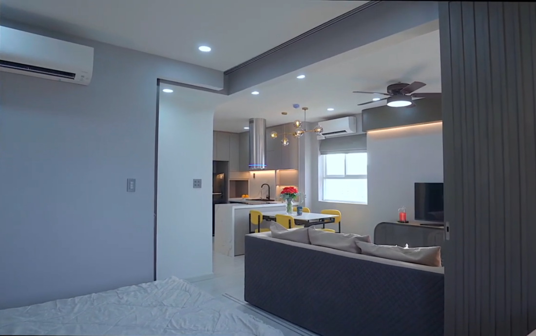 Điểm nhấn thú vị nằm ở phòng ngủ Master: một vách ngăn trượt giúp bạn linh hoạt điều chỉnh không gian. Chỉ cần kéo nhẹ, vách ngăn ẩn vào tường, mở rộng không gian ngay tức thì. Khi cần riêng tư, đóng lại là xong – vừa tiện lợi vừa thông minh.