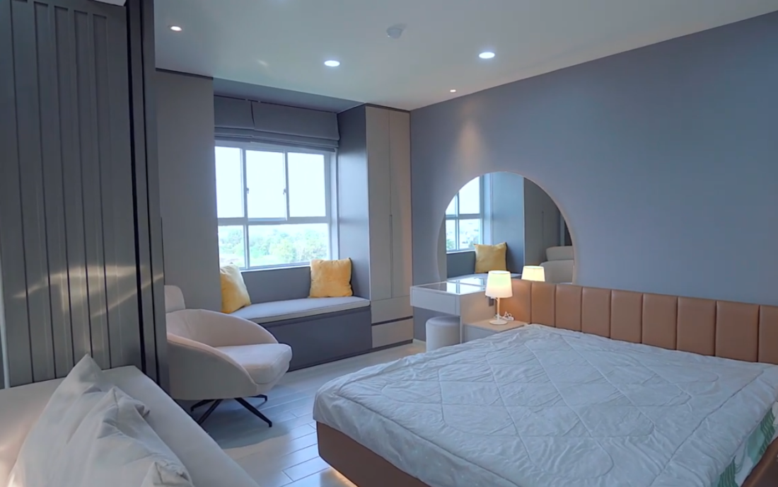 Ngoài ra giải pháp trang trí nội thất còn sử dụng những chi tiết nhỏ để đánh lừa cảm giác không gian. Chẳng hạn, một chiếc gương tròn lớn trên giường không chỉ là điểm nhấn ấn tượng mà còn giúp phòng ngủ Master trông rộng hơn. Ánh sáng tự nhiên từ ô cửa lớn tràn vào, kết hợp với những đường nét mềm mại trong nội thất, tạo nên một không gian ấm cúng và dịu dàng.