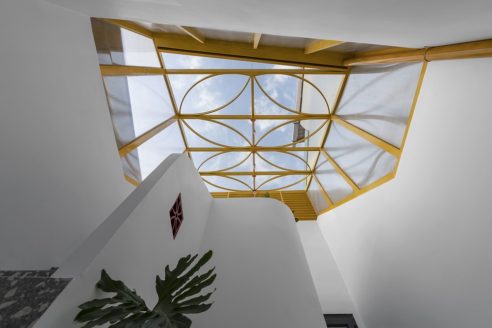Đường cong là yếu tố nổi bật của công trình, với nhiều chi tiết xuyên suốt như: ô cửa, hoa sắt bảo vệ, trần thạch cao, mảng tường, gạch bông gió, lan can,...