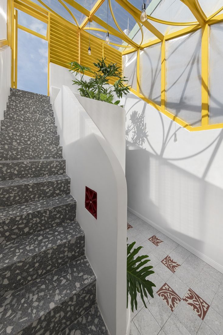 Cầu thang dẫn lên sân thượng, những mảng xanh được bố trí giúp điều hòa khí hậu cho không gian công trình.