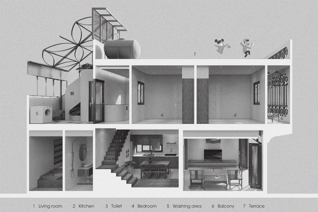Công trình này có tên gọi QHouse với quy mô 1 trệt, 1 lầu và sân thượng. Theo chia sẻ của các kiến trúc sư Acspace, cấu trúc của ngôi nhà là tường gạch bao che, sàn bê tông cốt thép và không có cột bê tông. Trải qua hơn 50 năm, nhìn chung phần khung của ngôi nhà khá ổn, tường không nứt.