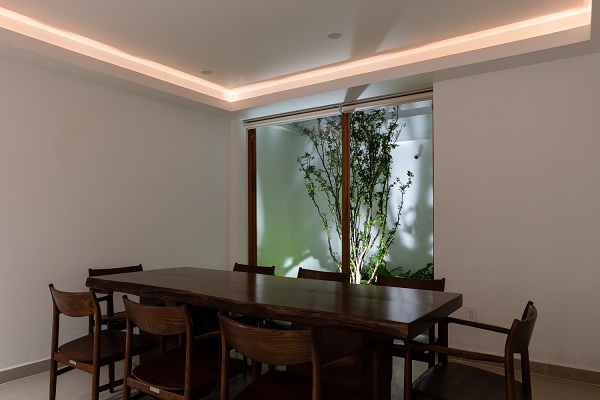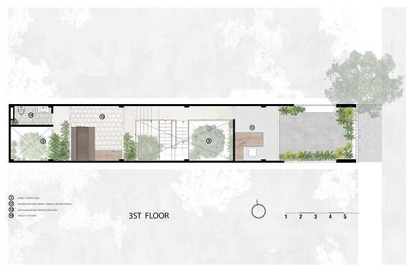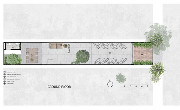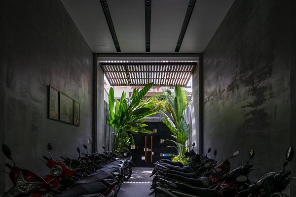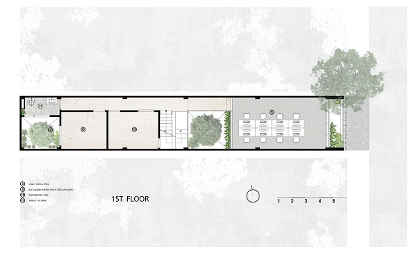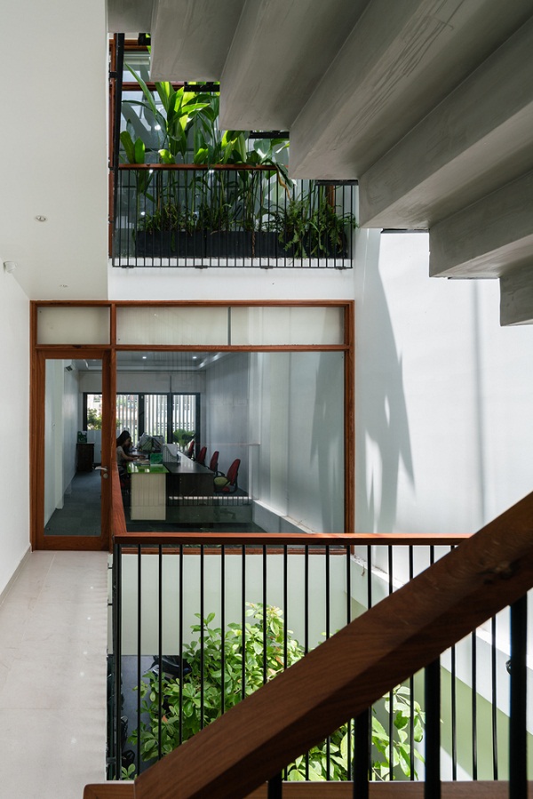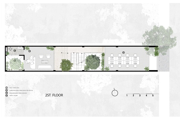 Văn phòng được hoàn thành là một câu chuyện có nhiều thay đổi lớn liên quan đến công năng từ chủ đầu tư. Lúc đầu, chủ đầu tư muốn một ngôi nhà cho 5 thành viên gồm có 1 bác lớn tuổi, 1 cặp vợ chồng và 2 bé nhỏ. Lợi thế của công trình này là chiều dài nên nhóm kiến trúc sư muốn sử dụng tính năng này để tạo ra các không gian tương tác và liên kết với các thành viên bên trong, sự cân bằng giữa tĩnh và động, giữa chuyển động với ánh sáng và thiên nhiên.