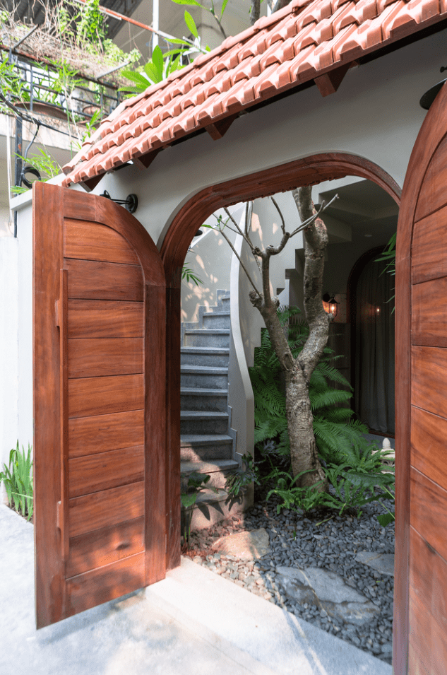 Tầng trệt, ngay cửa chính thêm lớp mái lợp gạch nung, sân rải đá xen kẽ là những loại cây nhiệt đới giúp không gian phòng khách thông thoáng và đón ánh sáng tự nhiên.