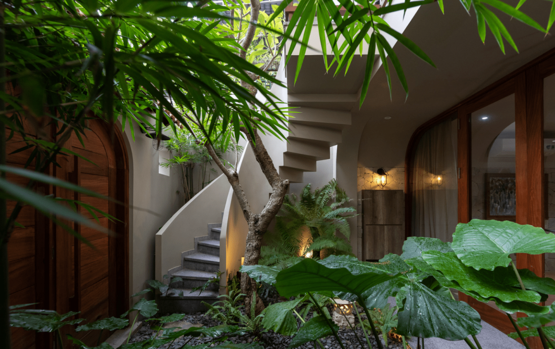 Không gian xanh bố trí xuyên suốt dọc ngôi nhà cũng được chăm chút, biến nơi đây thành khu vườn nhiệt đới xanh mát mang đến cảm giác dễ chịu ngay khi bước qua cánh cửa.