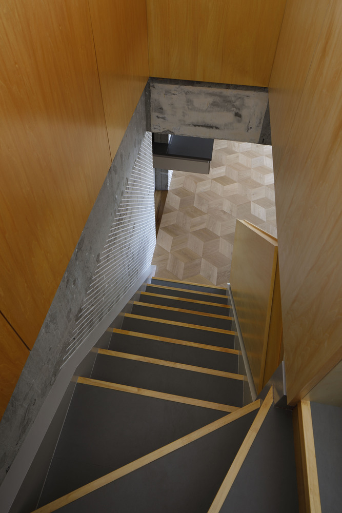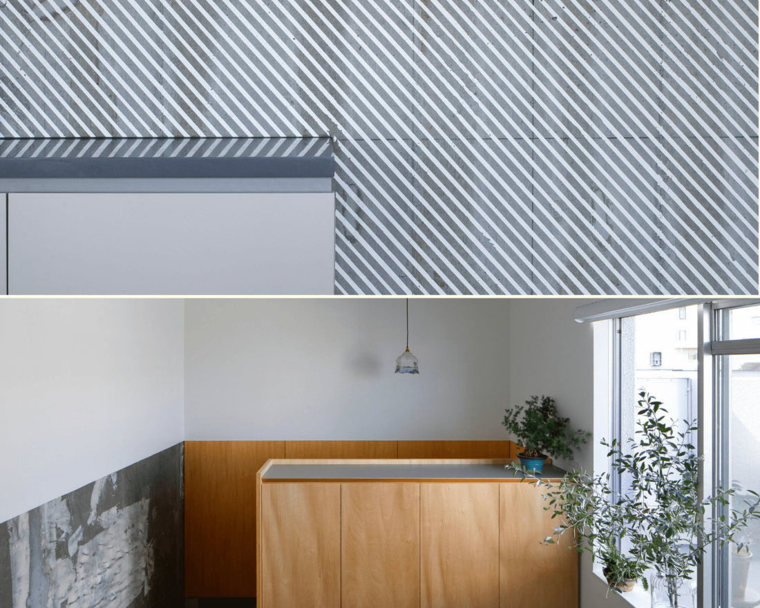 Theo thời gian ngôi nhà còn lưu lại những tàn tích cũ như mảng ố trên phần tường ngoài, kiến trúc sư sẽ dùng lớp sơn hoàn thiện qua các đường thẳng chéo nên lớp bê tông trên tường trông mềm mại và mảng ố cũng không còn thấy được bằng mắt. Các đường kẻ sơn này cũng được áp dụng tại một góc của cầu thang.