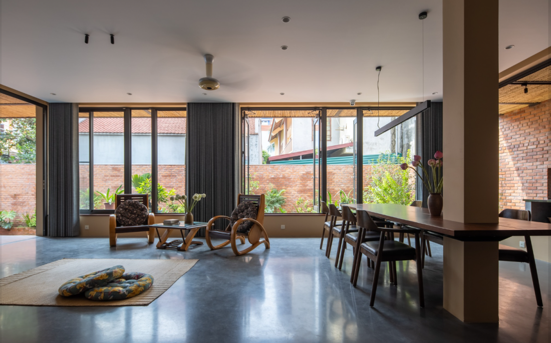 Ngôi nhà được xây trên mảnh đất 120m2 là một tổ ấm ba thế hệ, đã giải quyết hai bài toán lớn tiếng ồn và bụi mịn từ quốc lộ sầm uất.