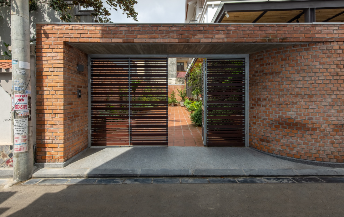 Cánh cửa cũ mang ký ức: Những cánh cửa gỗ cũ kỹ từ một ngôi nhà khác của gia đình ở nội thành Hà Nội (xây năm 2010) đã được tái sử dụng trên mặt tiền mới. Hành động này không chỉ là giải pháp kiến trúc mà còn là cách dệt nên một sợi dây ký ức từ một thời đại khác của gia đình vào công trình hiện tại.