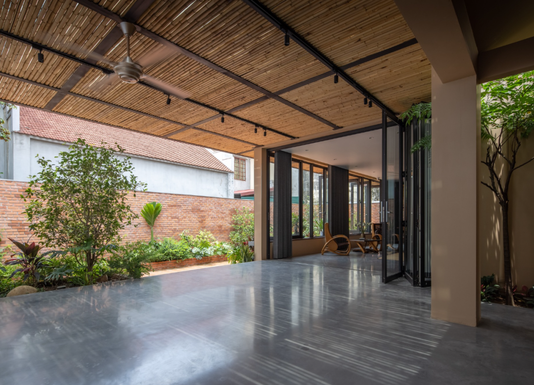 Hiên nhà lớn (Veranda): Một hiên nhà rộng chạy dọc theo sân trước, đóng vai trò kết nối trực tiếp gian thờ tổ tiên với các không gian sinh hoạt trong nhà. Khoảng hiên này giúp làm mờ ranh giới giữa trong và ngoài, mang lại hơi thở của cuộc sống truyền thống Việt Nam vào kiến trúc hiện đại.