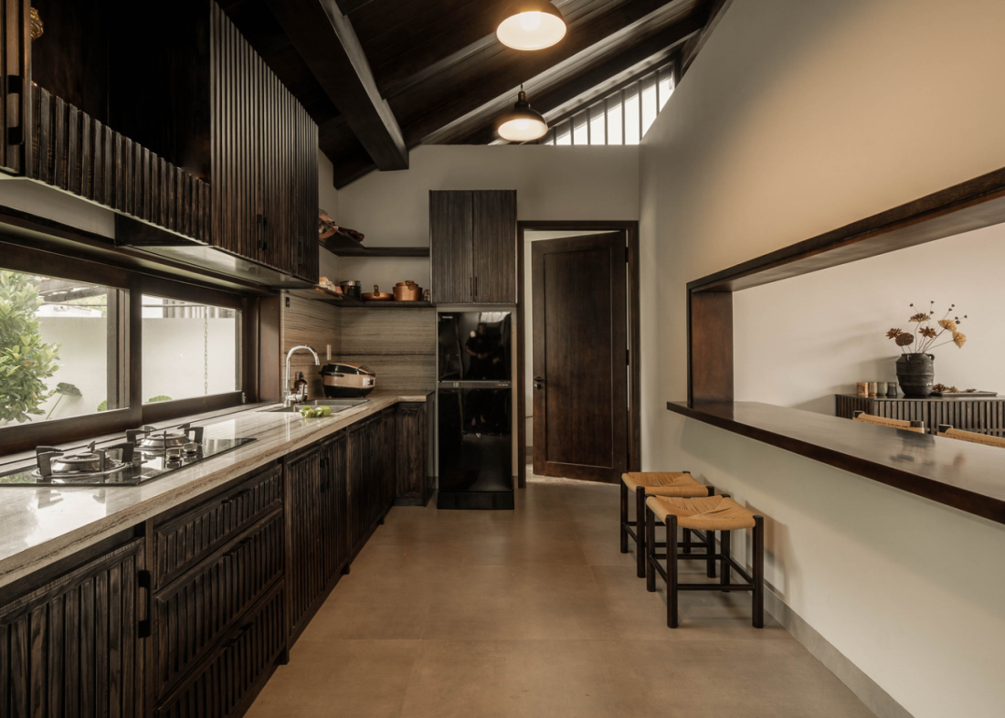 Tiếp theo là nhà bếp, một phần của chái cũ nhưng được hiện đại hóa. Bếp gas hiện đại kết hợp với kệ gỗ tái chế. Khu vực này mở ra hiên sau, giúp khói bếp thoát ra nhanh chóng và mang gió tự nhiên vào.