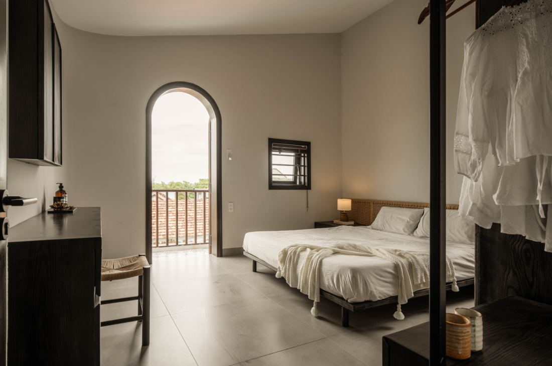 Bên trong phòng ngủ Master bố trí giường gỗ thấp, cửa sổ lớn đón ánh sáng, giúp không khí lưu thông, với tầm nhìn ra sân vườn, mang lại cảm giác bình yên như đang ở chốn quê.