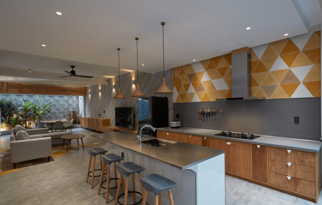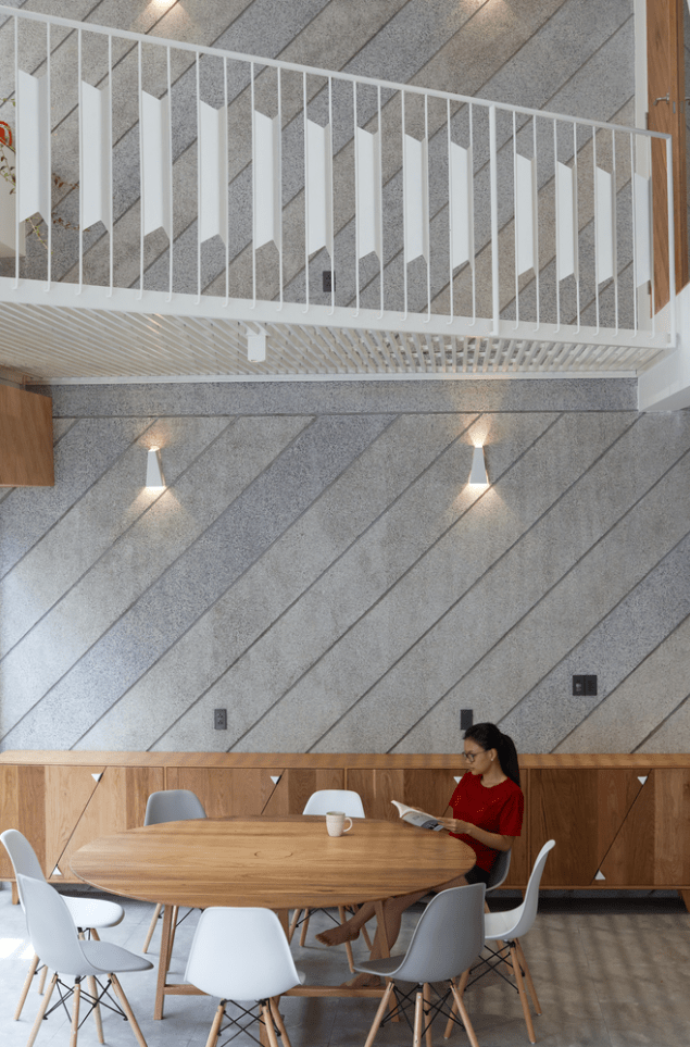 Ngôn ngữ đường chéo mới cũng được lặp lại trên các bề mặt nội thất và các khoảng trống của ngôi nhà như gạch lát nền, tường gạch terrazzo và đá mài tạo nên sự thống nhất về mặt hình học cho công trình.