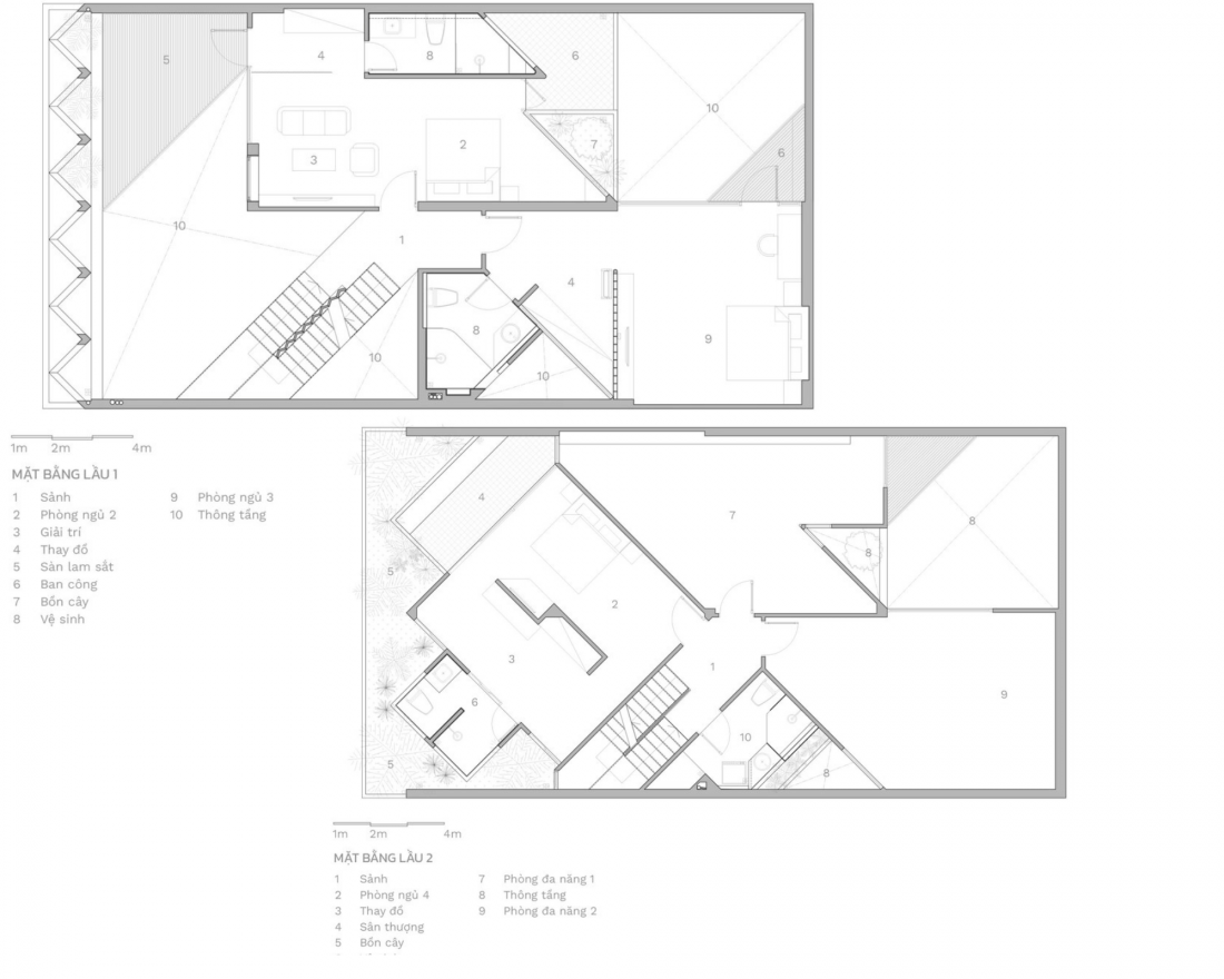 Vì ngôi nhà cũ có bố cục hình chữ nhật với nhiều phòng nhỏ, giải pháp tích hợp các đường chéo 45 độ của hình tam giác tạo ra những bức tường mới cắt ngang mặt bằng theo đường chéo. Điều này không chỉ định hình lại các phòng mà còn mở ra phần giếng trời, sân trong và khoảng thông tầng giúp tối ưu hóa ánh sáng tự nhiên.