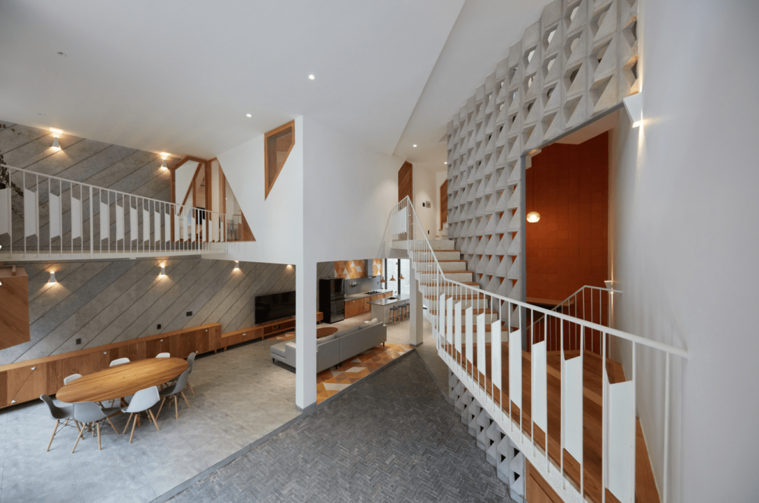 Chính vì phá vỡ cấu trúc vuông vắn thành những đường xéo nghiêng kết hợp với khối hình tam giác từ ngoài vào trong, từ thiết kế đến chất liệu nên đã mang đến một sự trải nghiệm sống mới cho chủ nhà.