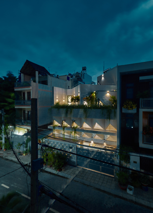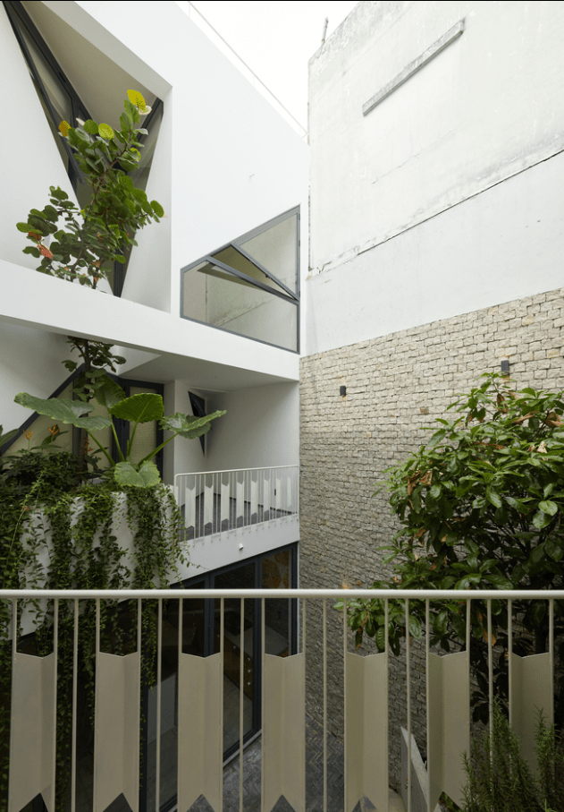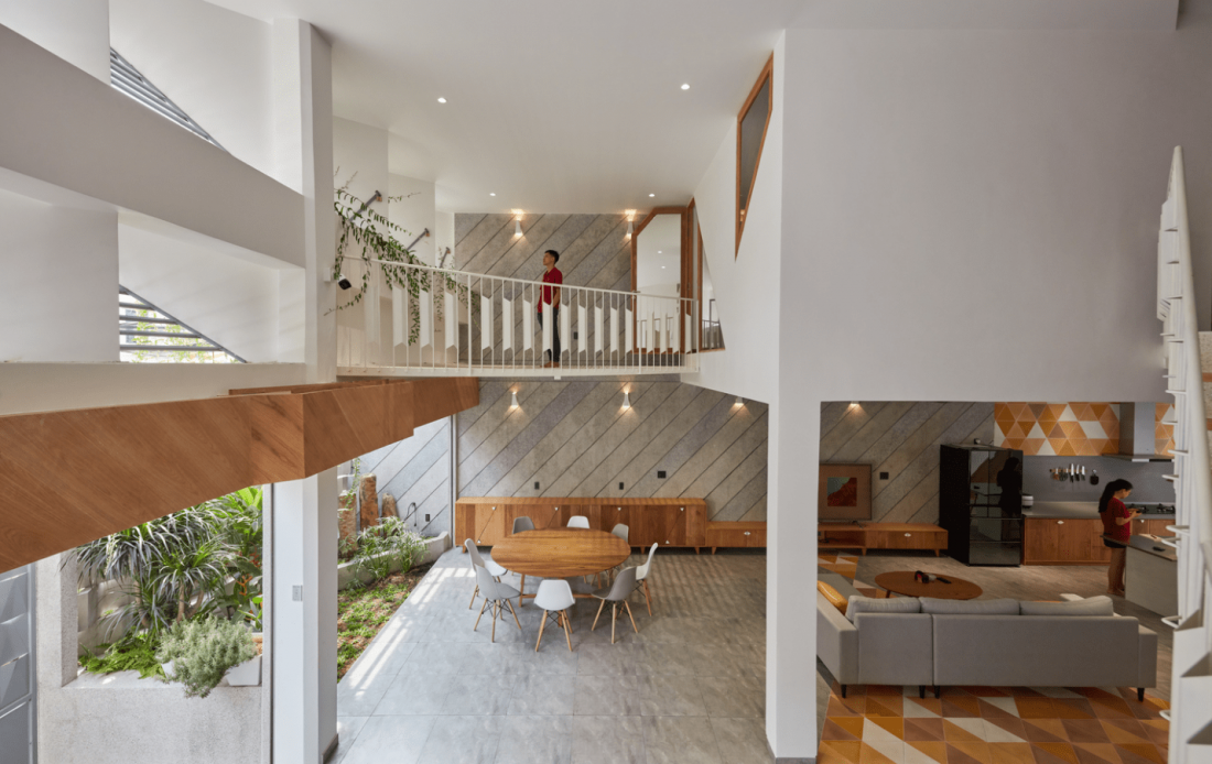 Việc phân chia các không gian hình tam giác có cùng điểm giao nhau giúp việc di chuyển các phòng được dễ dàng. Mỗi phòng đều có cửa để mở thông ra khu vực giếng trời tạo điều kiện thông thoáng và linh hoạt hơn.