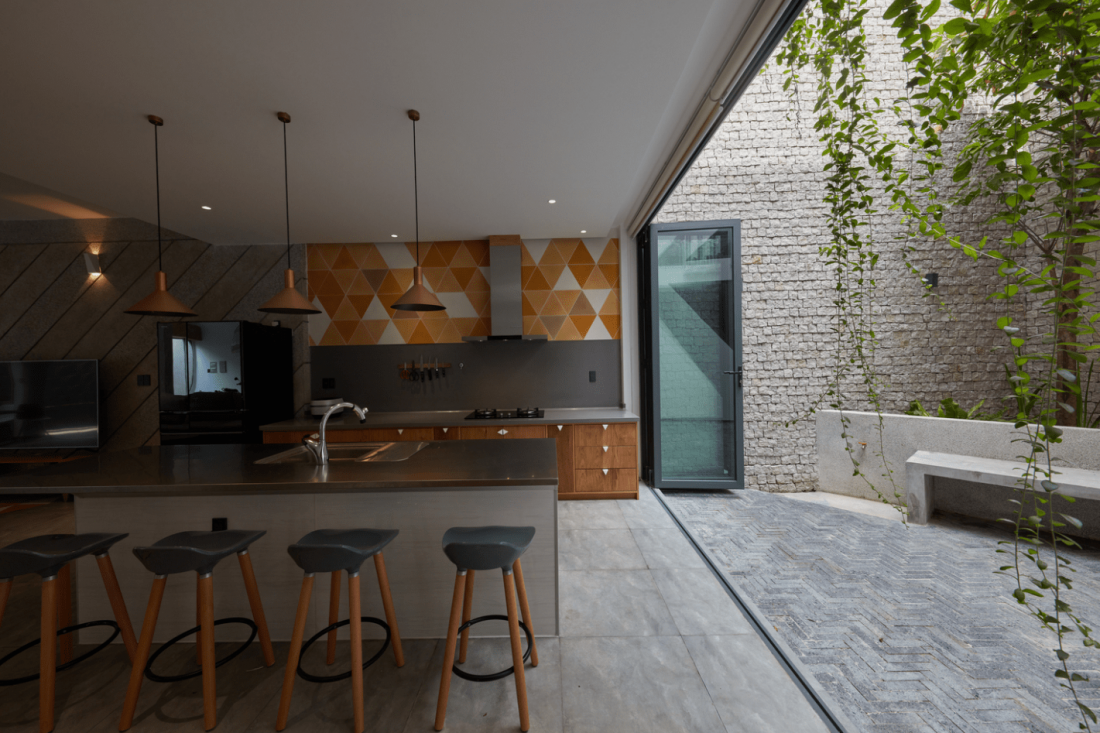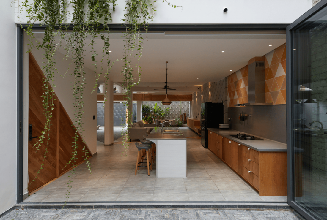Ngoài ra, yêu cầu không gian sinh hoạt chung của các thành viên tập trung tại tầng trệt nên kiến trúc sư đã thiết kế trang trí đảm bảo đầy đủ công năng, thông thoáng, đón ánh sáng tự nhiên qua giếng trời và hệ cửa kính xếp lùa – kết nối tối đa khu vực bếp và ngoài sân vườn phía sau thành một không gian lớn. Từ đó mọi người sẽ cảm thấy ngôi nhà rộng hơn và thoải mái hơn.