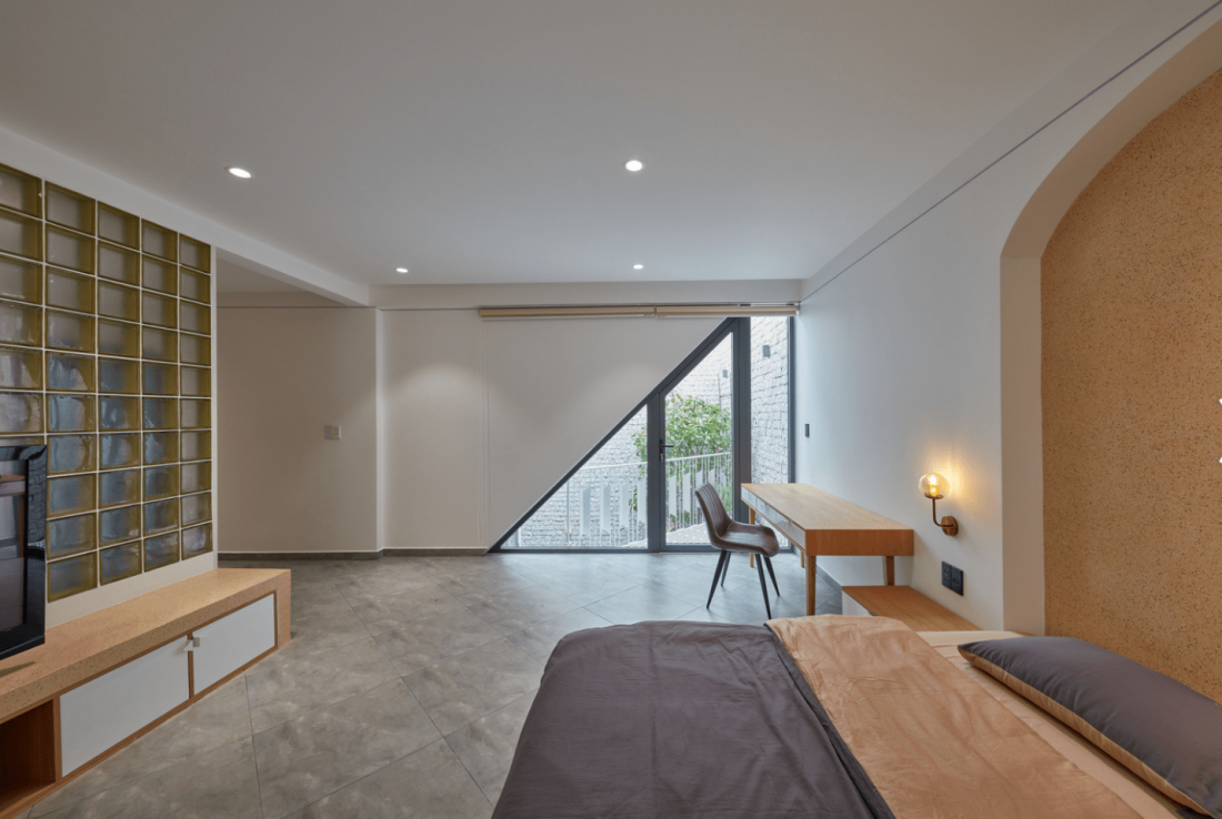 Ngôi nhà sau cải tạo có 4 phòng ngủ được phân bổ từ tầng trệt đến lầu 2, trong đó phòng ngủ của bố mẹ ưu tiên bố trí tầng trệt, lầu 2 có 2 phòng ngủ thiết kế trước và sau nhà, mỗi phòng ngủ đều mở ra ban công bằng sắt hướng ra khoảng thông tầng. Còn lại 1 phòng ngủ ở lầu 2 kết nối với 2 phòng đa năng khác.