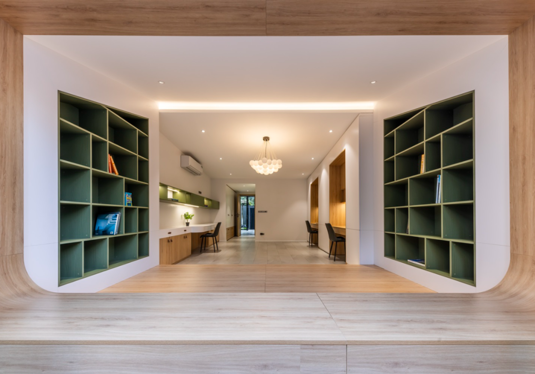 Các không gian được giữ lại cấu trúc như phòng khách, nhà bếp, khu ăn và gara, riêng phần cải tạo chính là cầu thang, phòng cho trẻ, phòng ngủ. Cụ thể di chuyển cầu thang và lối vào lên phía trước giải quyết vấn đề giao thông và thúc đẩy sự lưu thông không khí.